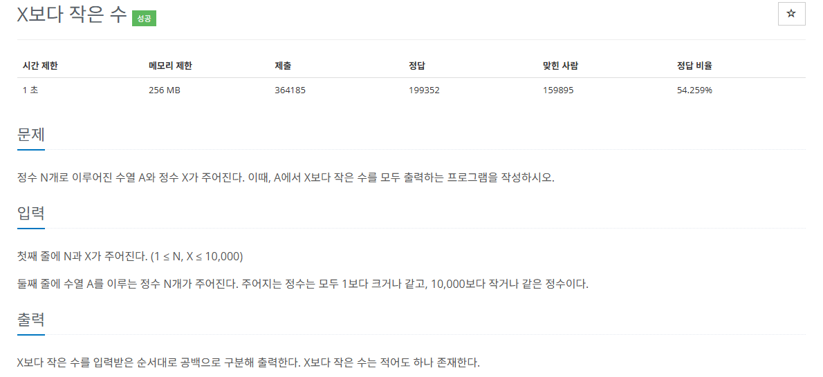 [풀이] 우선, 정수 X의 값이 필요하기 때문에 input 변수와 num 배열에 받은 값을 저장한 뒤 int x 변수에 X의 값을 저장했다.그리고 두번째 줄에 주어지는 수열 A를 string으로 받은 뒤에 int 배열로 변환시켜서 num3 배열에 저장했고, for문을 통해 배열 num3을 차례차례 돌도록 했다.그 다음 마지막으로 if문을 사용해서 차례대로 방문한 배열의 숫자가 x보다 작을 시에 그 숫자와 공백을 함께 출력하도록 만들었다. [답]using System;class Program{ static void Main() { string input = Console.ReadLine(); string[] num = input.Split(" "); int ..
